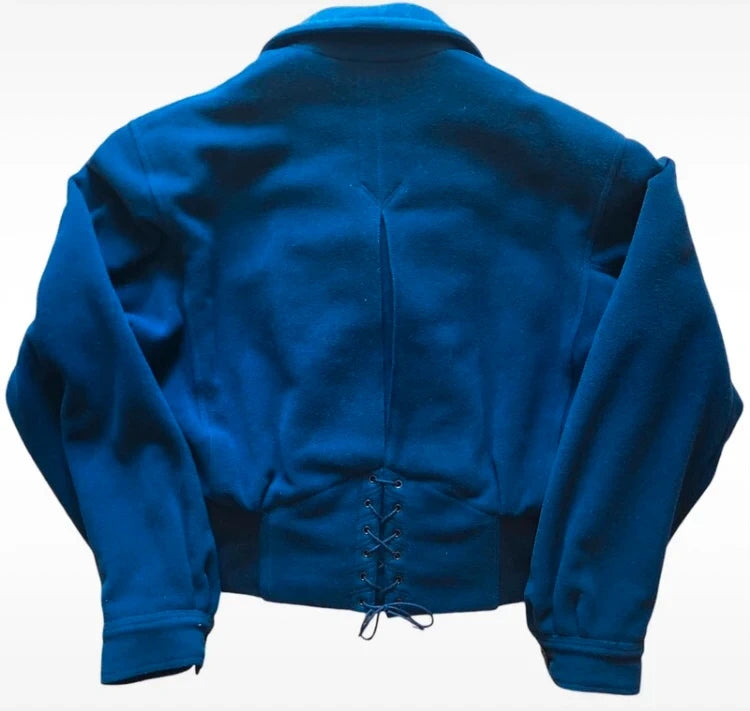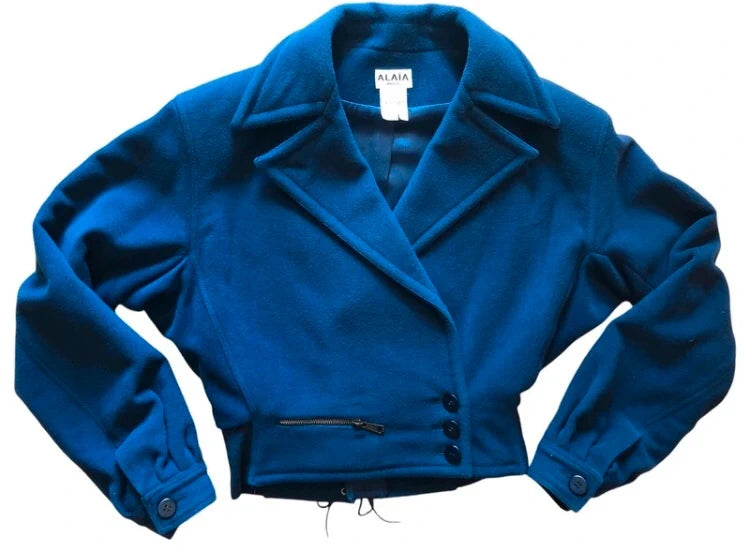 Azzedine Alaia jacket made from a wool blend, featuring button closure in the front and an intricate lace corset detail in the back.