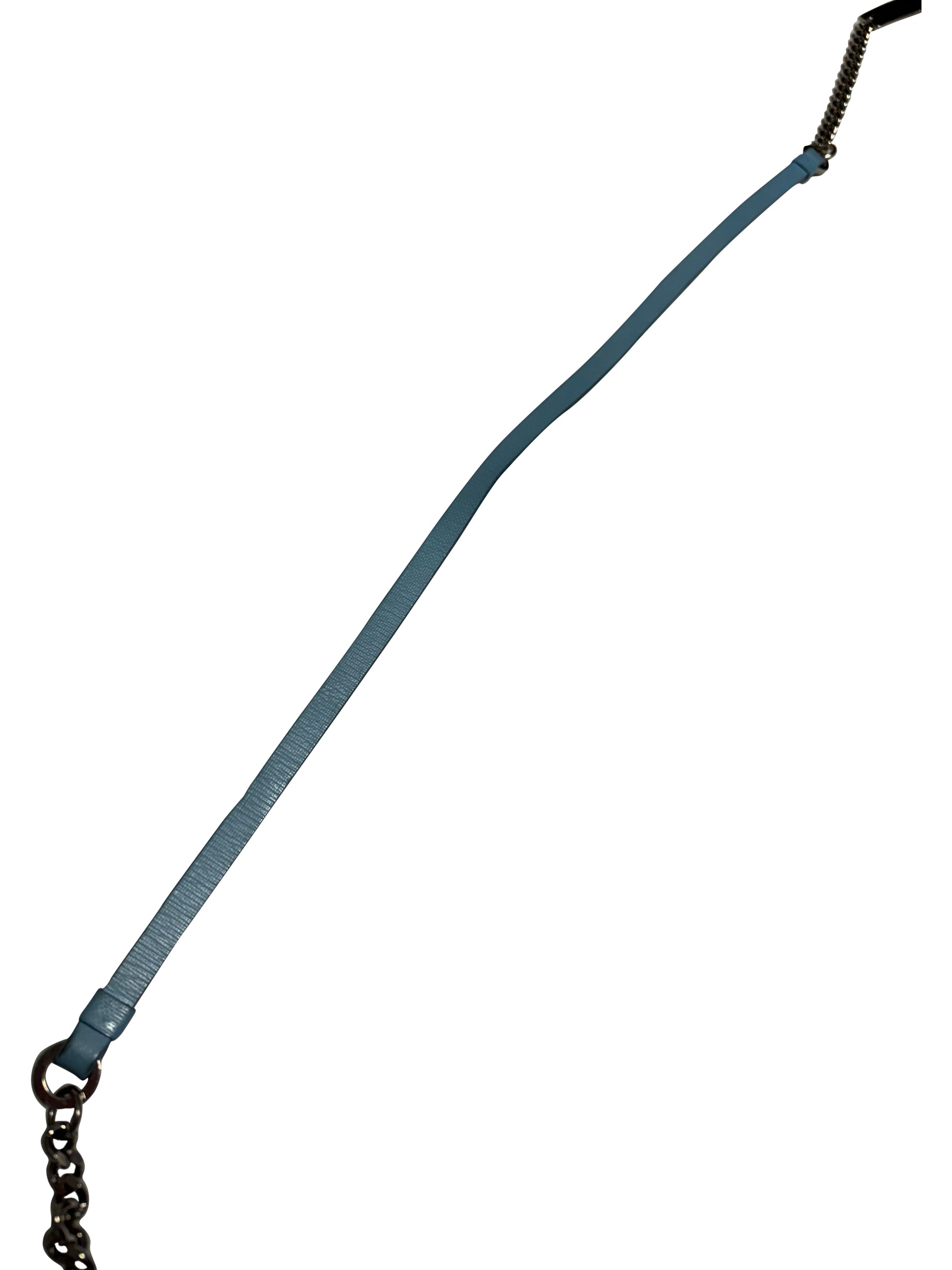 A Christian Dior belt from the hardcore collection, featuring a silver chain with Dior Logo buckle, baby blue leather strap and crystal encrusted carabiner closure.