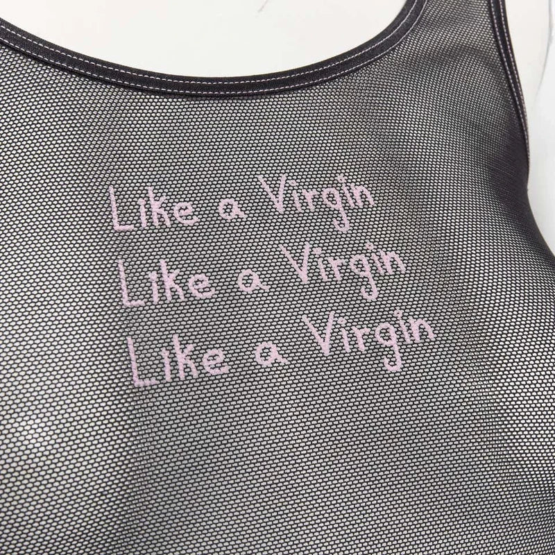Dolce& Gabbana mesh two piece set composed of a tank top and panty, featuring the ‘Like a virgin’ print.