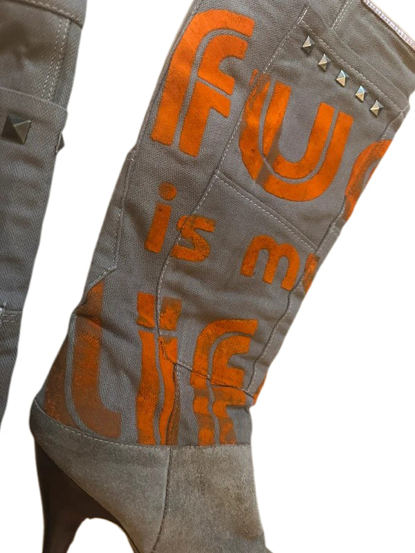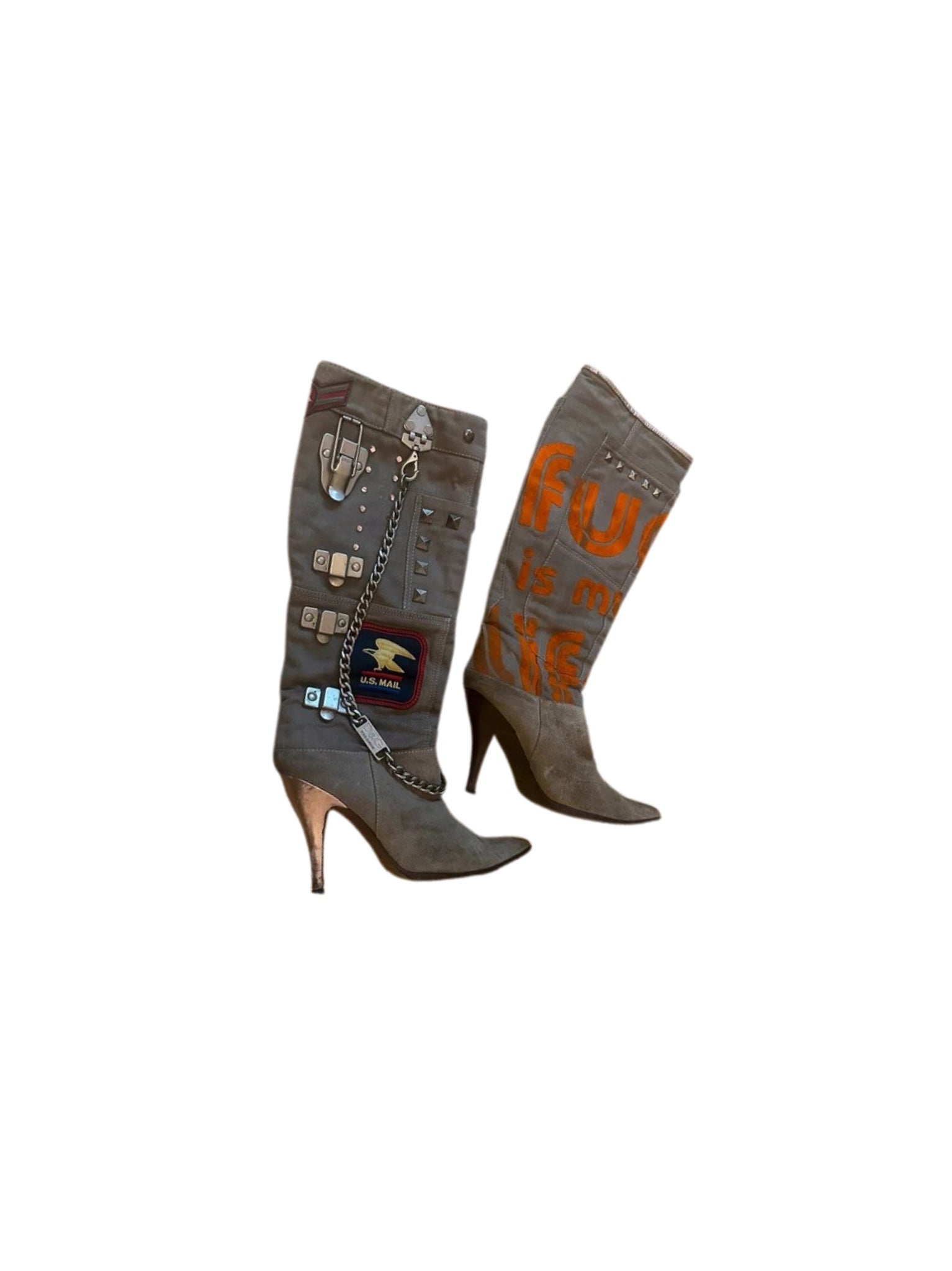 A pair of khaki Dolce& Gabbana boots adorned with chains, studs and patchwork.