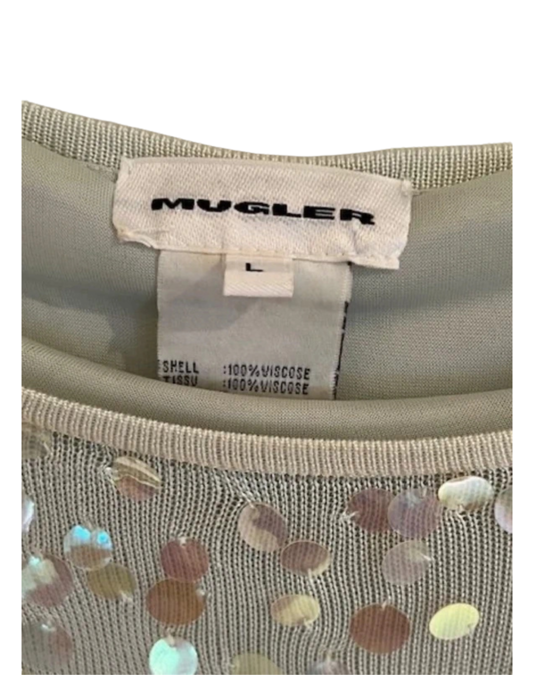 A Thierry Mugler dress featuring different sized sequins on a beige stretchy fabric.